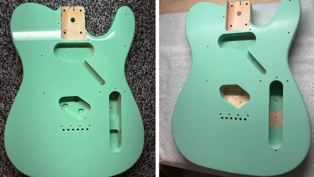 We are almost done with the body. The last step is to soften the shine of the finish to give it a little bit of a vintage appearance, without damaging the body. This is a super easy task: Simply rubbing the lacquer with some 0000 steel wool and an abrasive cloth will break its high-gloss appearance. It takes time to do this evenly, but it’s worth the time and work. It will look much better afterwards, and the outcome on this test guitar was awesome. If you ever decide that you want to go back to a high-gloss finish, this process can easily be reversed by simply polishing the body until it shines again. There’s so much paint on the body that you can play this game several times without permanently damaging the finish. Here’s a comparison of the original high-gloss and the now-matte look of the body.